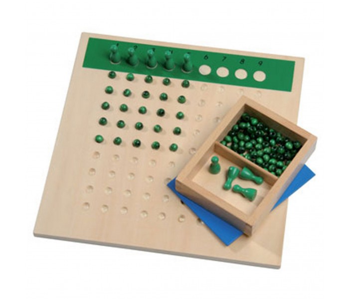 Há 9 buracos de 9 x 9 no tabuleiro, bem como 81 contas verdes para as colocar. Na fila superior encontrará um campo verde com 9 buracos maiores, assinalados com os números de 1 a 9. Com eles, a tarefa está definida. Por exemplo, peça às crianças para descobrirem quais os números que são divisíveis por cinco, seis, sete, e assim sucessivamente. Vai descobrir quais os números que são divisíveis entre 1 e 81 sem resto.