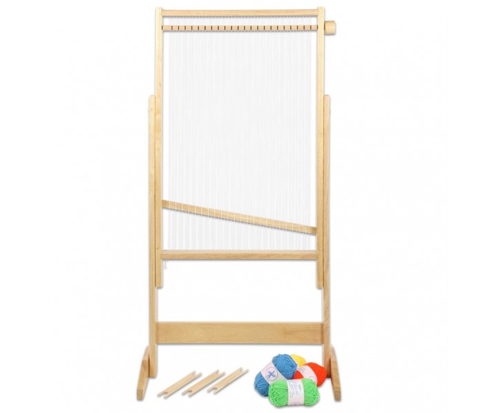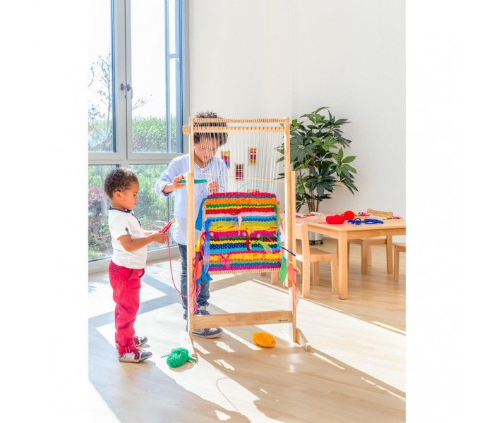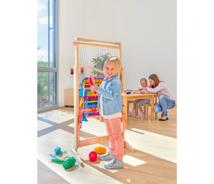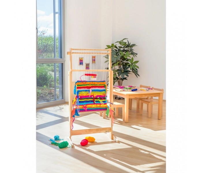 Grande prazer de tecelagem no enorme tear. O enorme tear pode ser desenhado consoante a estação e é ideal para praticar as suas primeiras tentativas de tecelagem. Use o tear no último ano do jardim de infância com as crianças em idade pré-escolar ou peça a crianças do 1.º ao 4.º ano para fazerem um projeto de grupo. Para além da lã, tecidos e fios, materiais naturais como ervas, musgos e muito mais também podem ser processados. A destreza, coordenação olho-mão e habilidades motoras finas das crianças são treinadas. O tear já está esticado, para que possas começar a tecer imediatamente na superfície de tecelagem de 80 x 48,5 cm.