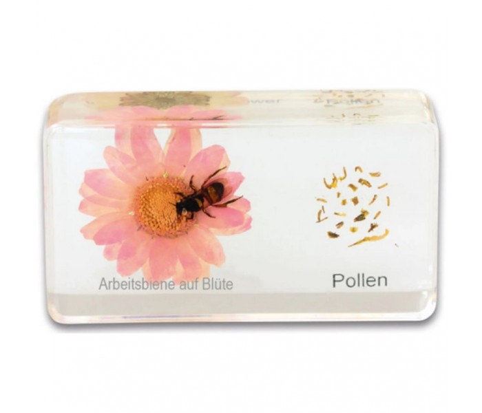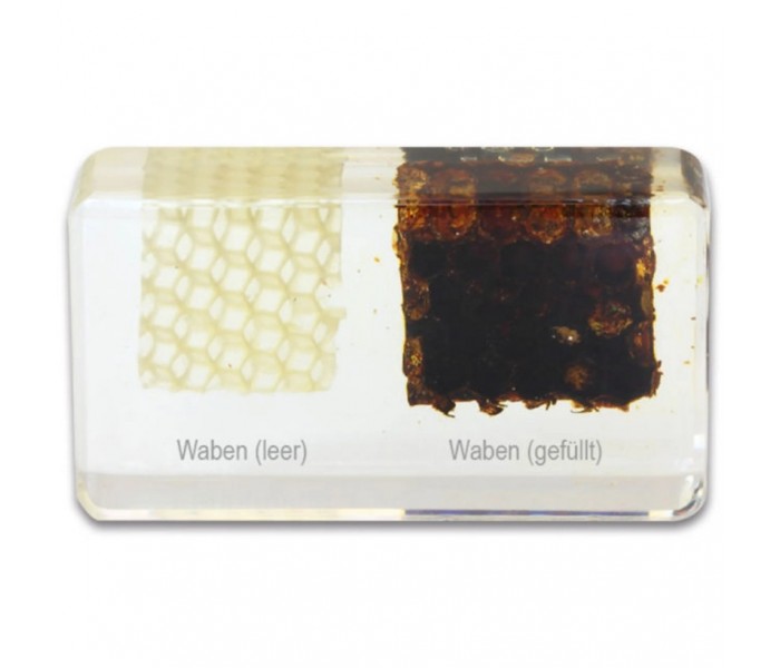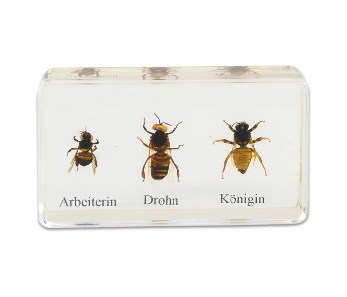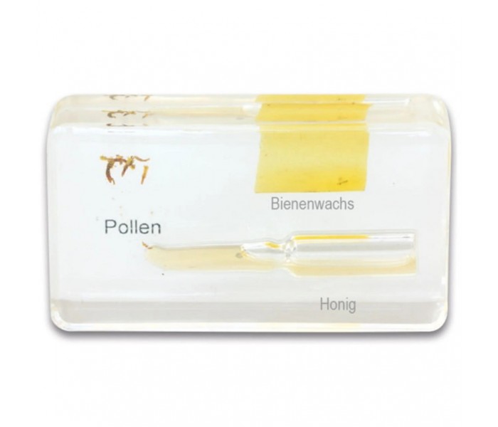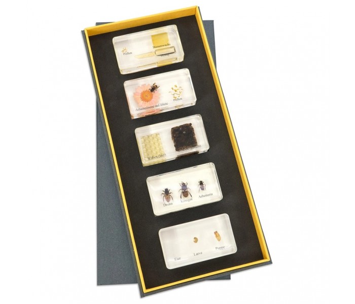 O ciclo de vida da abelha melífera mostra as diferentes fases de desenvolvimento, desde ovo para larva e pupa, até operária ou rainha. Além disso, os seus alunos em idade escolar irão observar muitos detalhes importantes da vida dos trabalhadores produtores de mel ao analisarem as inclusões. Isto oferece uma oportunidade para colocar questões e transmitir o material de aprendizagem de forma prática: é fascinante observar a estrutura básica, bem como o favo de mel cheio, o pólen, a cera de abelha, o mel e um trabalhador a sugar o néctar. O material ilustrativo é a raça "Apis mellifera ligustica".